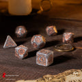 - Komplektacija: 7 poliedriniai kauliukai (D4, D6, D8, D10, D100, D12, D20) ir metalinė moneta.