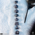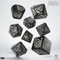 Oficialiai licencijuotas kauliukų rinkinys, įkvėptas Nakties Sargybos iš Game of Thrones, su žvilgančiais juodais paviršiais ir šviesiu graviravimu. Dizaino detalės atspindi Sieną, budrius varnų simbolius, liepsnojančius deglus ir priesaikos „Kardas tamsoje“ motyvus, užtikrinančius aiškų skaitomumą ir teminį vientisumą stalo žaidimų sesijose. Tinka stalo vaidmenų žaidimams ir įvairiems stalo žaidimams, suderinama su standartinėmis RPG sistemomis.