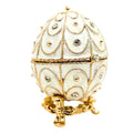 Elegantiška dekoratyvinė dėžutė Fabergé stiliaus kiaušinio formos, skirta smulkiems papuošalams ir atminimo daiktams. Kruopščiai dekoruota kristalais, padengta balta emale su auksiniais akcentais, pasižymi solidžia metalo konstrukcija ir subtiliu, kolekciniu charakteriu. Puikiai tinka svetainei, miegamajam ar vitrinai kaip rafinuota interjero detalė.