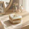Elegantiška širdies formos papuošalų dėžutė su subtiliais kristalų akcentais ir blizgiu emaliu. Balta ir auksinė spalvų derinys suteikia išskirtinį, tvarkingą įvaizdį, o tvirtas metalinis korpusas užtikrina ilgaamžiškumą kasdien naudojant. Kompaktiškas dydis pritaikytas žiedui, auskarams ar mažoms smulkmenoms laikyti.