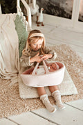 Išraiškingos akys suteikia tikrovišką žvilgsnį. Komplekte yra čiulptukas. Lėlytė vilki šviesiai rožinius drabužėlius su šilta kepuraite ir kojinytėmis – rankų darbo rūbeliai kruopščiai pasiūti iki smulkmenų.