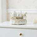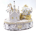 Elegantiška muzikinė dėžutė karietos formos su baltu paviršiumi ir auksinėmis detalėmis sukurta subtiliam vestuvių akcentui ir išliekamai dovanos vertei. Klasikinė „Mendelsono vestuvių maršo“ melodija suteikia šventiškumo, o dekoratyvus dizainas lengvai dera prie įvairių interjero stilių. Tinka pastatyti ant židinio, komodos, stalo ar lentynos kaip išraiškinga namų dekoro detalė ir sentimentali vestuvių dovana jaunavedžiams.