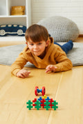 Rinkinyje: 130 Plus-Plus detalių, baltas pagrindukas, 4 dideli ratai, 10 dvipusių užduočių kortelių. Veiklos pavyzdžiai: domino, bokštų statymas, boulingas, kūryba ant pagrinduko, juokingi veidukai, ilgiausios „gyvatės“ iššūkis.
