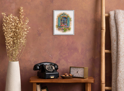 Elegantiškas siuvinėjimo kryželiu rinkinys su lango ir gėlių motyvu padeda kurti subtilų, dekoratyvų kūrinį namų interjerui ar dovanai. Aiškus piešinys ir tvarkinga kompozicija leidžia susikoncentruoti į kruopštų darbą bei estetišką rezultatą.
