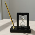 Rašiklio laikiklis su stiklinio smėlio laikrodžiu padeda efektyviai planuoti trumpas užduotis, skatina susitelkimą ir suteikia stalui tvarkos. Tai praktiškas biuro aksesuaras, tinkantis vadovams, teisininkams, gydytojams ir visiems, vertinantiems estetiką bei funkcionalumą. Puikus pasirinkimas kaip subtili interjero detalė, pabrėžianti profesionalumą ir laiko svarbą.