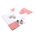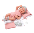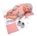 Aprengta kelnaitėmis, kepuryte, kojinytėmis ir pirštinytėmis, su seilinuku. Rinkinyje rožinis pledukas ir čiulptukas.