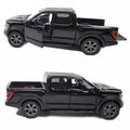 Žaislinis automobilis – tikro 2022 Ford F‑150 Raptor juodo modelio miniatiūra.