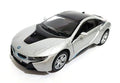 Licencijuotas BMW i8 žaislinis automobilis, sidabrinės spalvos, tikro modelio sumažinta versija.