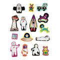 Kosmoso tematikos žaidimo dėžė su 15 dvipusių medinių figūrėlių.