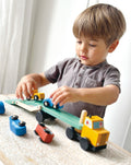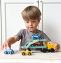 MENTARI medinis autovežis su 3 spalvingais automobiliukais. Viršutinis aukštas pakeliamas ir nuleidžiamas patogiam pakrovimui.