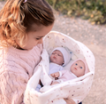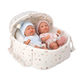 Realistiškos dvynukų lėlės su baltu nešiojamu krepšiu sukurtos patogiam žaidimui ir lavinimui. Vienas kūdikėlis su atmerktomis akimis, kitas – užsimerkęs, todėl rinkinys atrodo itin tikroviškai. Lankstomos rankos ir kojos leidžia sodinti, statyti, keisti pozas ir lengvai aprengti. Minkštas medžiaginis pilvukas ir švelnus polivinilas suteikia malonią lietimo patirtį, o rankų darbo rūbeliai užtikrina kruopštų apdailos lygį. Tinka naudoti su įvairiais žaisliniais vežimėliais.