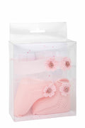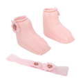 Rožinės spalvos lėlių aksesuarų rinkinys, sudarytas iš kojinyčių ir lankelio, dekoruotų nertomis gėlytėmis. Skirtas kūdikio lėlėms, kurių ūgis 40–45 cm. Patogiai užmaunami elementai papildo lėlės garderobą ir tinka kasdieniam žaidimui.