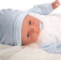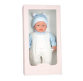 Realistiškos išvaizdos kūdikėlio lėlė su garsu, skirta maloniam ir saugiam žaidimui. Ši 42 cm žaislinė lėlė pasižymi švelnia polivinilo danga ir išraiškingomis akimis, o žydri ir balti rūbeliai sukurti kruopščiai, rankų darbo. Paspaudus pilvuką, lėlė verkia, todėl žaidimas tampa dar tikroviškesnis.