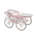 Reguliuojamas stogelis, lopšys su nusegamu užklotu, apačioje – tinklinė lentynėlė lėlytės daiktams. Ant rankenos kabinama deranti rankinė. Pastelinė rožinė ir pilka spalvų paletė suteikia švelnumo ir stiliaus.