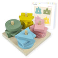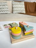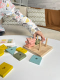 Edukacinis žaidimas su lenta, 4 stiebeliais ir keturių tipų geometrinėmis figūromis su skylutėmis: kvadratais, stačiakampiais, trikampiais ir apskritimais, nudažytais švelniomis pastelinėmis spalvomis.