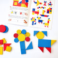 Rinkinyje 48 skirtingos kaladėlės – nė viena nesikartoja. Kiekviena iš jų skiriasi bent vienu parametru: forma, spalva, storiu arba dydžiu. Pridedama 12 psl. instrukcija su įvairaus sudėtingumo užduotimis.