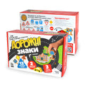 Rinkinyje: 13 medinių kelio ženklų, 2 mediniai automobiliai be ratų, lipdukų komplektas figūrėlėms dekoruoti (ženklams, simboliams ir kt.), 3 spalvoti kartoniniai keliai po 42×60 cm. Sujungę kelius, pastatysite net 1,8 m ilgio trasą.