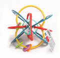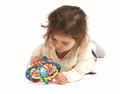 Spalvingas, originalios formos kamuoliukas–barškutis su skirtingų tekstūrų karoliukais ir žiedais, o centre – barškantis branduolys.