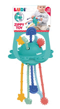 LUDI Zippy sensorinis ištraukiamas žaislas su virvelėmis ir pop-it burbuliukais, silikoninis kramtukas kūdikiams 10+ mėn.