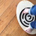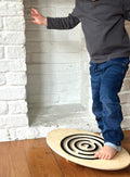 MENTARI medinė balansinė lenta su integruotu labirintu ir 3 kamuoliukais. Stovint ant lentos reikia išlaikyti pusiausvyrą, kad kamuoliukai nenukryptų nuo tako.