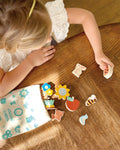 Rinkinyje 9 figūrėlės: morkų lysvė, saulėgrąža, gėlytės, bitė, boružėlė, sraigė, obuolys, paukštis ir triušis, taip pat medžiaginis maišelis su linksmomis iliustracijomis.