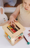 Medinis lavinamasis kubas su 6 veiklomis: metalofonas su kūjeliu, krumpliaračiai, besisukančios formelės, durelės su paslėptu paveikslėliu, laikrodukas ir keturios mažos sukamos plokštelės.