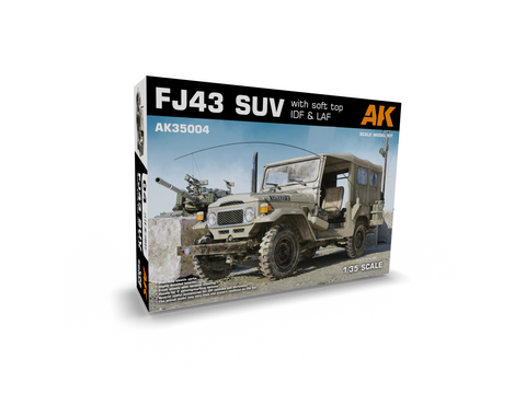 Plastikinis surenkamas modelis 1/35 mastelio (AK35004) – Toyota Land Cruiser FJ43 SUV su minkštu stogu, IDF ir LAF versijos. Rinkinyje: detalės, lipdukai (dekalės) ir surinkimo instrukcija. Pagaminta Ispanijoje. AK Interactive kokybė entuziastams.