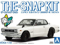 Plastikinis 1/32 mastelio surenkamas modelis automobilio Nissan Skyline 2000GT-R, balta spalva, Aoshima The Snap Kit serija. Rinkinyje: detalės, lipdukai, surinkimo instrukcija. Pagaminta Japonijoje.