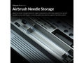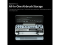 Universalus viskas viename aerografo priežiūros ir laikymo rinkinys, sukurtas profesionalams ir entuziastams. Preciziškai suformuotas korpusas su metaliniu dangteliu ir amortizuotais lankstais užtikrina stabilumą, patvarumą ir tikslų darbą.